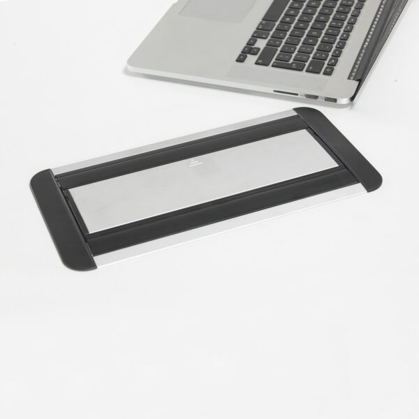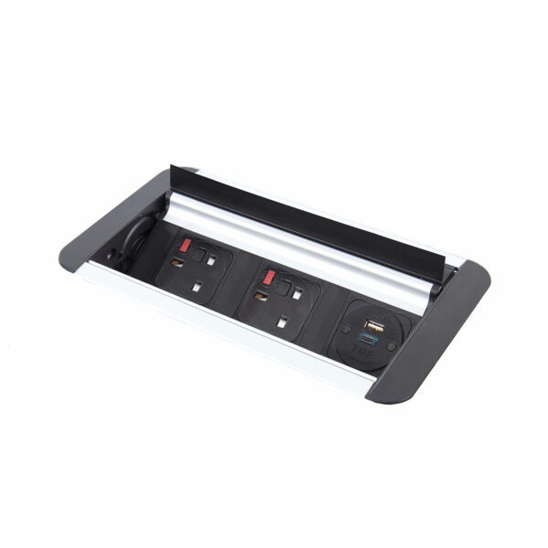 The Eclipse in-table rollover power module, featuring 2 UK sockets and 1 TUF USB charger with A & C connectors in a sleek black and silver finish, is a highly versatile solution designed for meeting tables and other areas where space efficiency and a clean, uncluttered look are essential. Engineered to function even when closed with power and data cables plugged in, the unit smoothly rotates open with a light touch, allowing access from both sides. This makes Eclipse an ideal choice for placement at the center of meeting and boardroom furniture, combining convenience with modern style.