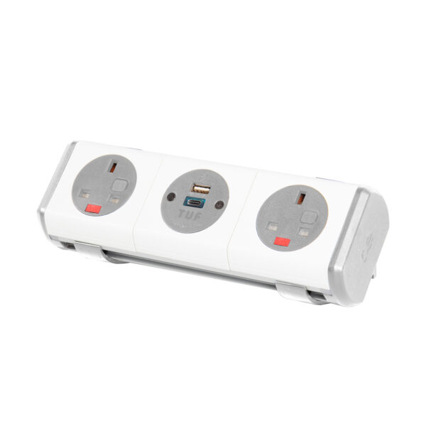 The Hubble clip-on power module features 2 UK sockets and 1 TUF USB charger with A and C connectors, designed to complement modern workstations with its clean lines and versatile colour options. This module offers easy desktop power access without the hassle of searching through cable trays under desks or floor service boxes. Its clip-on moulded front and rear decorative frames, with circular socket apertures, create a unique, compact design perfectly suited to contemporary office furniture.