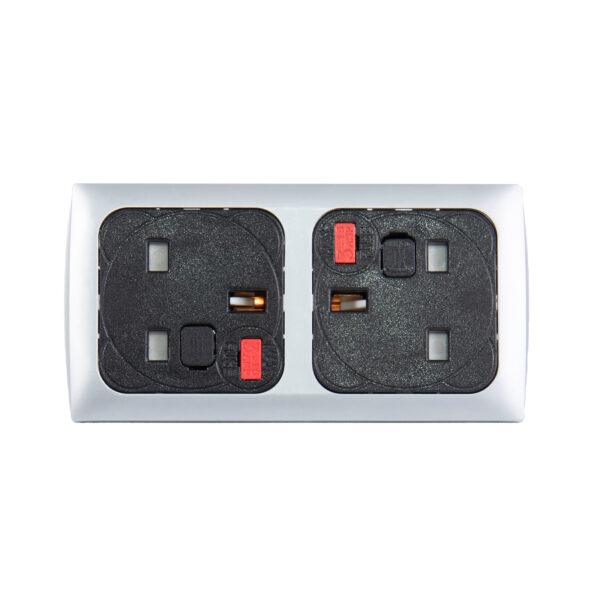 The Proton panel mounted power module in silver and black offers a sleek, minimalist solution for providing accessible power within office furniture. This version includes 2 UK sockets, making it ideal for powering multiple devices simultaneously.