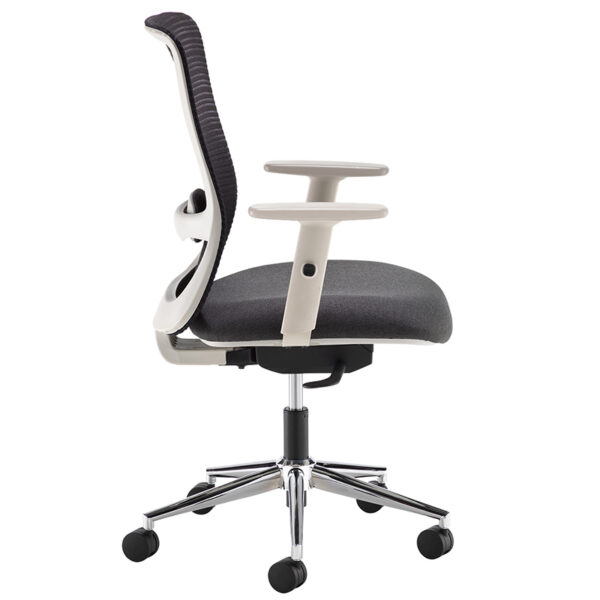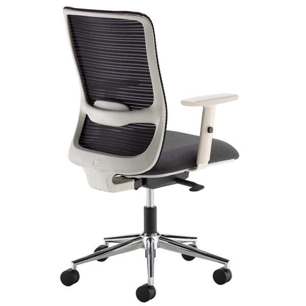 The Arcade Black Mesh Task Chair blends ergonomic innovation with sleek, modern styling. Inspired by the balance and alignment of classical yoga poses, its design promotes a comfortable and supportive sitting experience throughout the workday. The breathable black mesh back pairs seamlessly with a light grey frame, while the adjustable lumbar support ensures consistent contact with the spine—helping to reduce strain and improve posture. Finished with a chrome five-star base and curved edge detailing, Arcade offers a refined look that fits effortlessly into any workspace