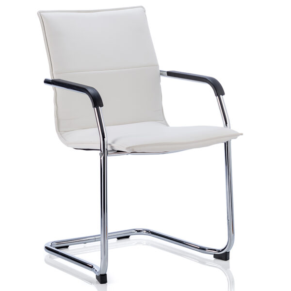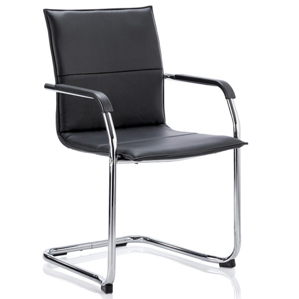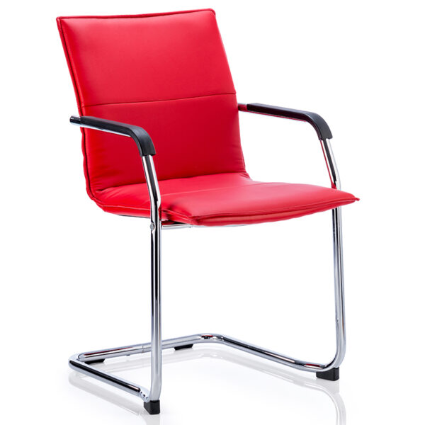 The Milo Faux Leather Cantilever Visitor Office Chair combines sleek design with practical functionality. Its fixed armrests feature bonded leather sleeves that offer comfortable support while enhancing the chair’s polished chrome frame. Designed with versatility in mind, the chair is stackable for convenient storage, making it a smart choice for offices, meeting rooms, and adaptable seating areas