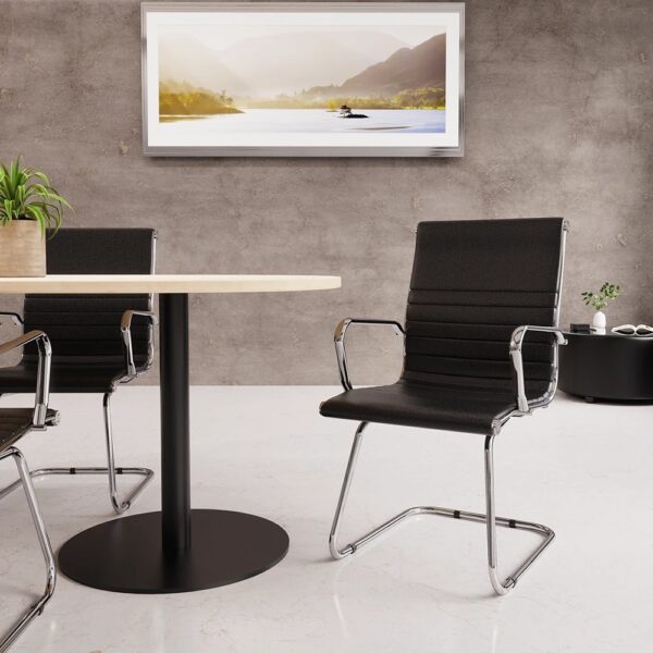 is its matching chrome armrests and cantilever frame. The sturdy design not only provides a modern touch but also ensures stability and longevity – giving you complete peace of mind when investing in this premium visitor chair.