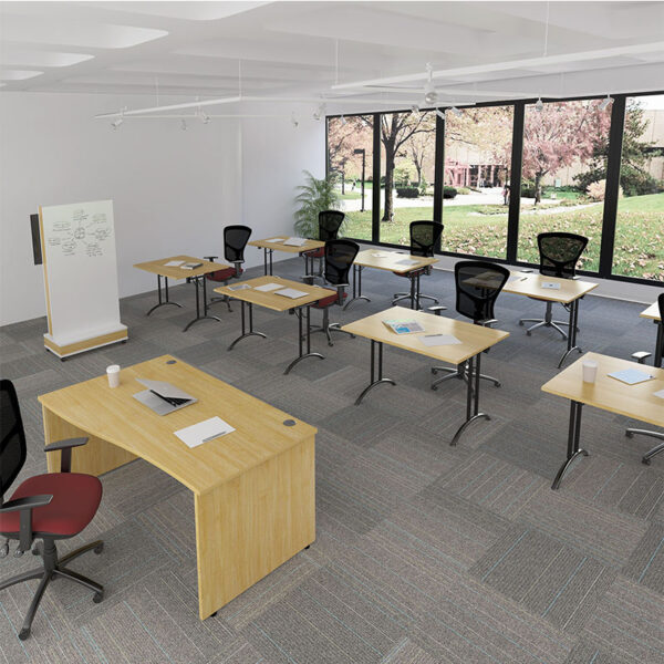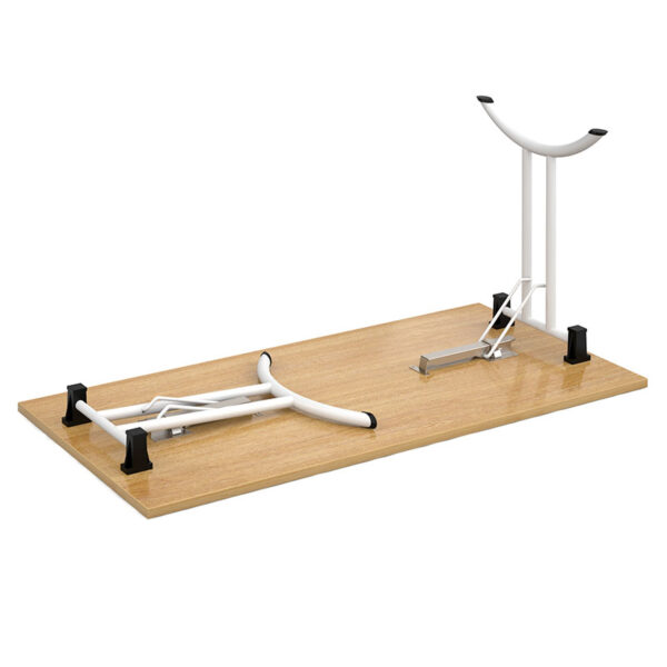 The Rectangular Folding Leg Table with Curved Foot Rails combines contemporary style with practical versatility, making it ideal for meeting rooms, conference suites, and exhibition spaces. Its curved folding leg design enhances visual appeal while providing generous legroom for seated users. The steel frame folds easily, allowing tables to stack neatly for compact storage. Designed for flexible layouts, it can be used individually or paired with trapezoidal and semi-circular tables. The 25mm scratch-resistant tabletop features durable ABS edging and is available in beech, oak, maple, white, or walnut finishes. An optional quick-release linking mechanism is also available for seamless table connections.