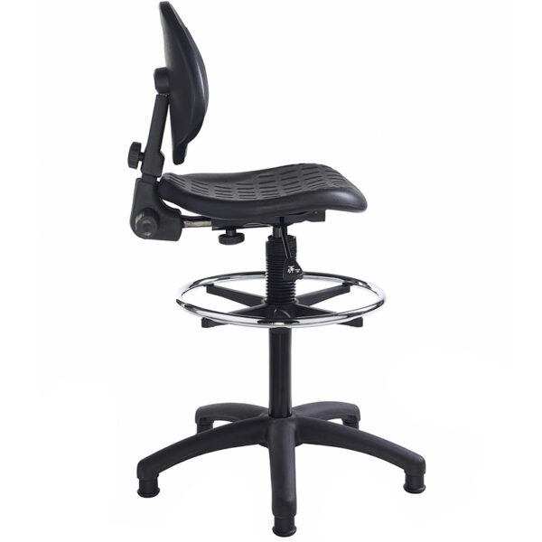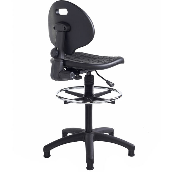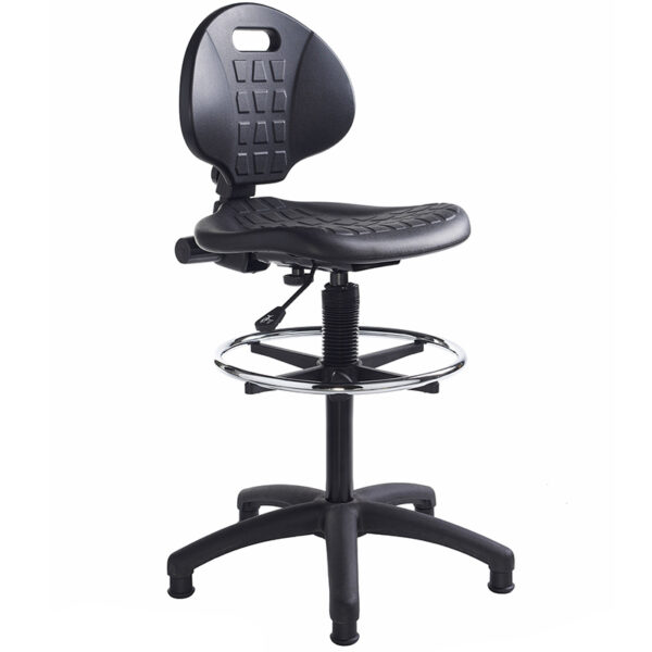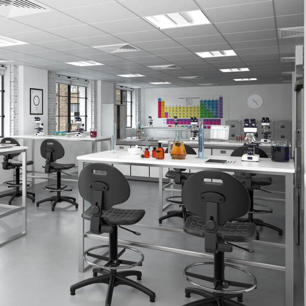 The Prema Industrial Operator Chair is a practical, entry-level solution for laboratories and busy workspaces. Its contoured polyurethane back and easy-clean seat offer durability and support in demanding environments. Finished in black with a large five-star base, 30mm glides, and a chrome-plated foot ring, it’s built for stability and comfort. With an extended gas lift for flexible height adjustment, Prema is a reliable choice for school labs and industrial settings alike.