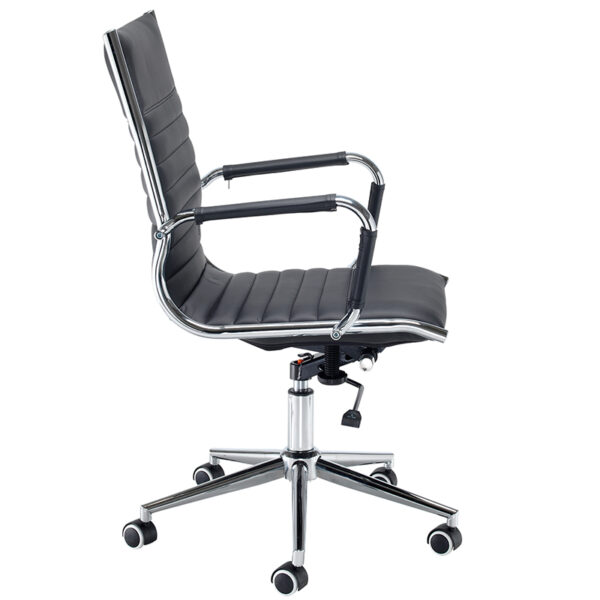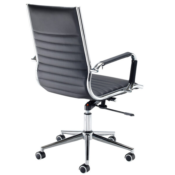 The Bari executive chair, along with its matching visitors chair, brings a refined touch to any office or conference space. Its classic black ribbed faux leather finish, available in both high and medium back options, offers lasting comfort and a polished look. Chrome arms and a sleek chrome base enhance its contemporary appeal, making it a standout choice for private offices. With a weight capacity of 120kg, gas lift adjustment, and tension control, the Bari chair combines style with reliable functionality.