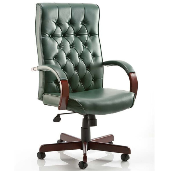 The Chesterfield Executive Chair blends timeless elegance with practical comfort, making it ideal for both home and office settings. Upholstered in bonded leather, it features a classic button-tufted backrest and deep cushioning that evoke traditional sophistication. The chair’s soft padded sleeves and wooden armrests enhance comfort, while the matching wooden five-star base reinforces its refined aesthetic. Equipped with a lock/tilt mechanism and adjustable weight tension control, it offers personalized support throughout the day. Available in a range of rich colours including brown, burgundy and green, this chair is a distinguished addition to any workspace.