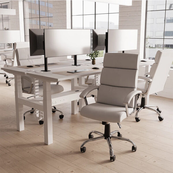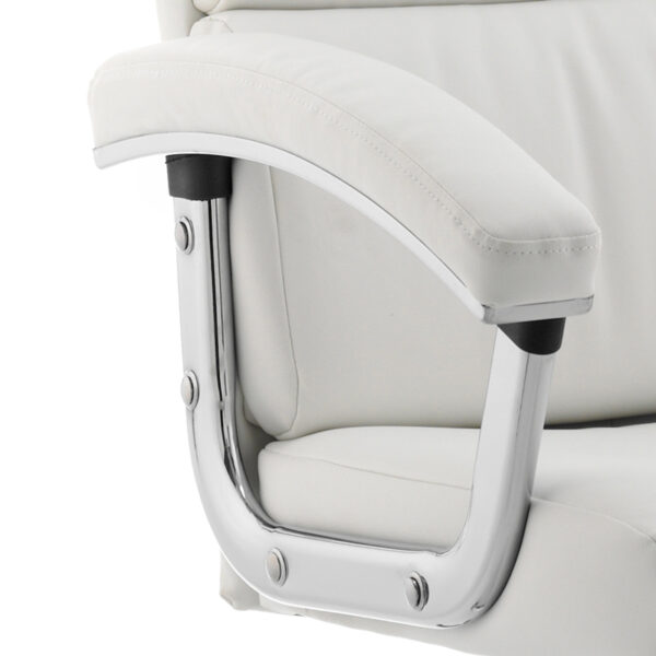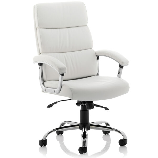 The Desire High Back Executive Chair blends simplicity with sophistication, offering a sleek modern profile that suits any professional setting. Its split-panel backrest is generously cushioned for lasting comfort, while the soft bonded leather upholstery pairs elegantly with a polished chrome five-star base and matching fixed arms. Designed for both style and support, the chair features a twin-lever infinite lock mechanism and cushioned arm pads, making it a refined choice for executive workspaces