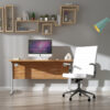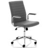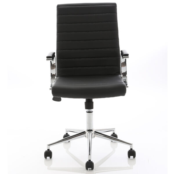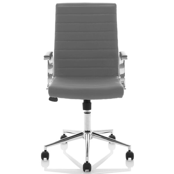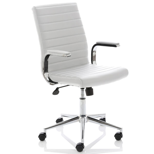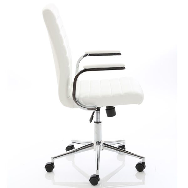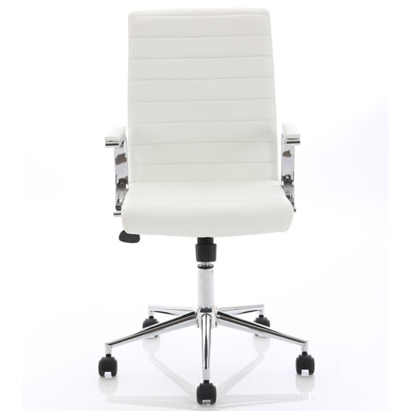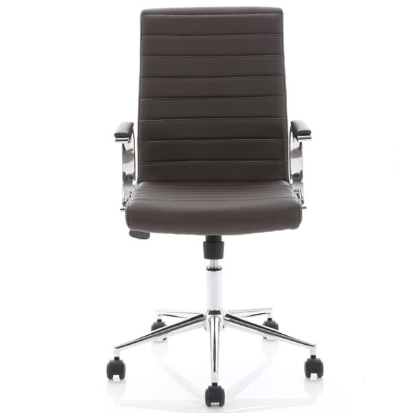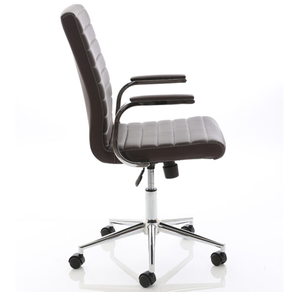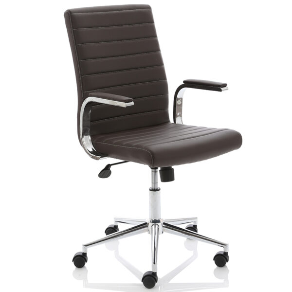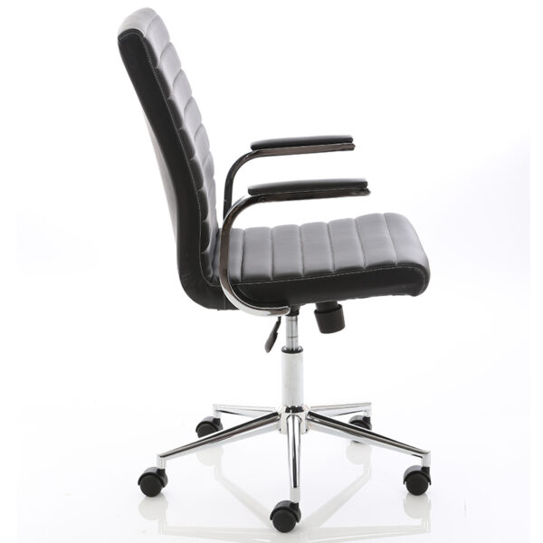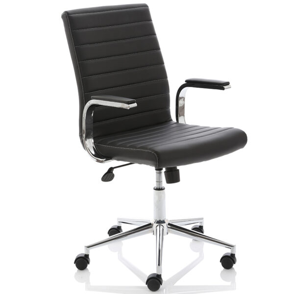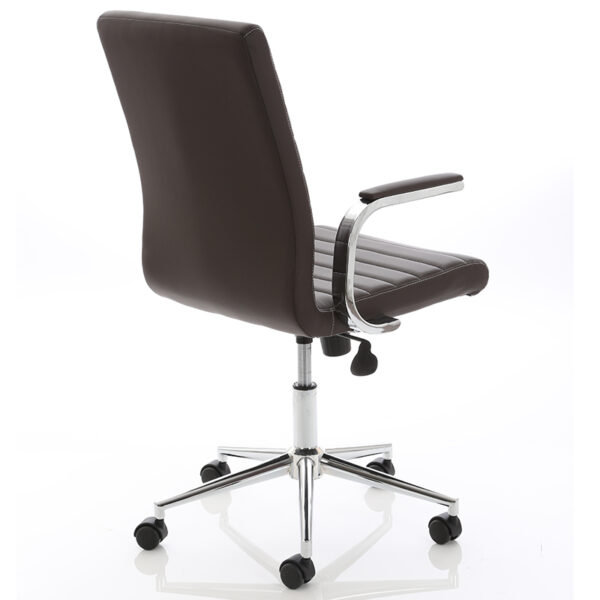 The Ezra Leather Managers Office Chair brings a bold blend of comfort and style to any workspace. With its soft-touch leather and sleek stitch detailing, it offers a refined aesthetic that suits both home and office environments. The chair features a smooth tilt and lock mechanism with adjustable tension, allowing for personalized recline and support. Chrome-accented padded boomerang arms add a distinctive touch, making Ezra as visually striking as it is comfortable.