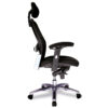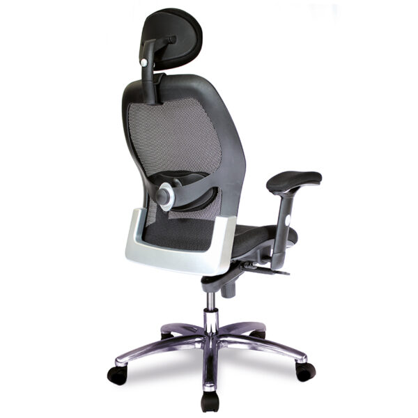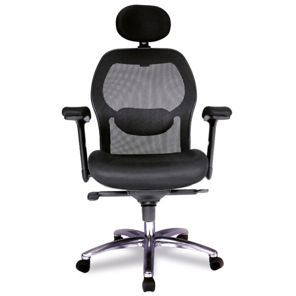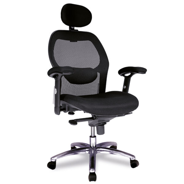Our high back mesh task chair combines ergonomic precision with sleek styling, designed to support long hours of focused work. It features a generously proportioned posture-curved upholstered seat with a waterfall front edge for improved circulation, paired with a contoured black mesh backrest detailed in nylon and equipped with adjustable lumbar support. The adjustable headrest enhances neck support, while the synchronous mechanism allows simultaneous seat and backrest adjustment, tailored to the user’s bodyweight with tension control. Finished with a polished chrome base and stylish T-shaped padded arms, this chair delivers comfort, flexibility, and a professional look.