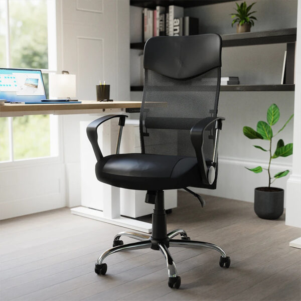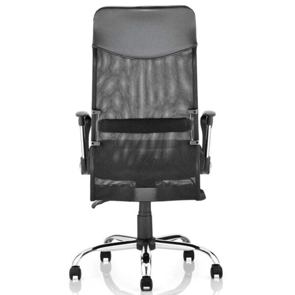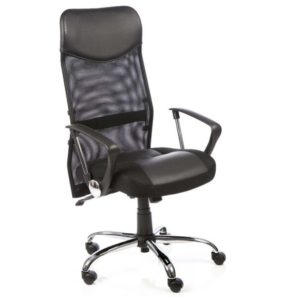 The Vegas Executive Chair offers a striking blend of mixed mesh, air-mesh, and leather for a distinctive, modern look. Its soft mesh back provides breathable support, complemented by a fixed lumbar bar that encourages healthy posture. The seat combines air-mesh and leather for both comfort and style, while the two-lever infinite lock mechanism allows for tailored reclining control. Finished with fixed nylon arms featuring chrome detailing, the Vegas chair balances sleek aesthetics with everyday functionality.