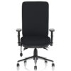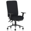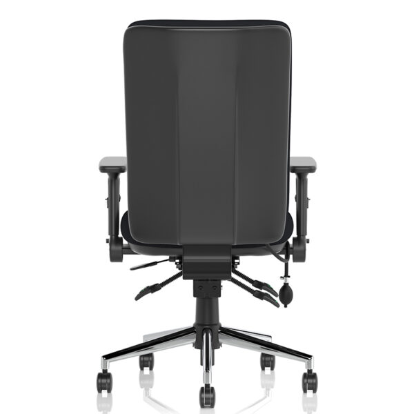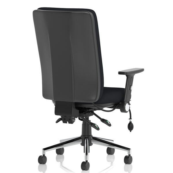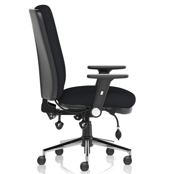 The Chiro High Back Fabric Operators Chair is built for 24-hour use and includes a height-adjustable ratchet backrest with pump-up lumbar support, contoured foam cushioning, a triple lever mechanism for independent seat and backrest tilt, a seat slide function, and a polished chrome five-star base.