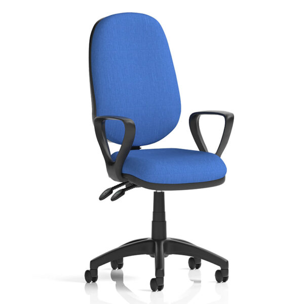 The Eclipse Plus II Lever Fabric Task Operator Chair with Loop Arms is a versatile and ergonomic seating solution ideal for daily use in any professional environment. Whether in a busy call centre or a modern home office, this high-back operator chair is designed to deliver lasting comfort and support. The contoured fabric backrest features a height-adjustable design and recline functionality that can be locked in any position or set to permanent contact for consistent back support. The chair is available in a selection of five standard fabric options and can also be upholstered in one of eight bespoke colours, allowing you to tailor its look to match your workspace or brand identity. Built for durability and comfort, it accommodates users for up to eight hours per day, supports a maximum weight of 150kg, and is also available with alternative arm options including height-adjustable arms or no arms at all. With dependable construction and a one-year manufacturer’s warranty, the Eclipse Plus II combines style, functionality, and long-term performance.