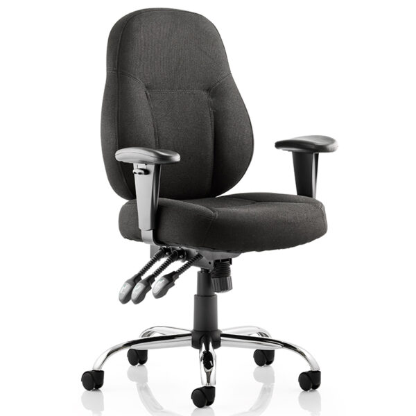 Combining comfort, durability and tailored functionality, the Storm Operator Chair is built for performance without compromising on style. It features a deeply cushioned seat and backrest, upholstered in your choice of bespoke fabric or Soft Bonded faux leather, finished with refined stitch detailing for a professional touch. The triple lever mechanism offers precise back and seat angle adjustments, while the soft PU pad arms are height adjustable to support long hours of use. Its sleek five-star chrome base adds a modern flourish to its solid, ergonomic design