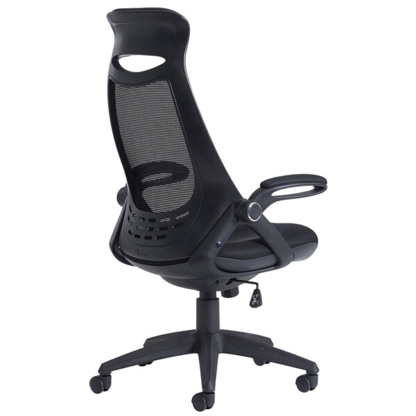 The Tuscan high back manager’s chair is designed with a distinctive contoured back and integrated headrest that naturally follows the shape of the spine, offering balanced support and comfort throughout the day. Upholstered in black faux leather or with a fully upholstered back and a choice of black or blue fabric seat, it combines generous cushioning with a sleek, modern pillow-style silhouette. The nylon five-star base with 50mm easy-glide castors ensures smooth mobility, while the headrest doubles as a convenient spot to hang coats or jackets. With gas lift height adjustment, weight tension control, and a standard tilt lock, Tuscan delivers both ergonomic function and executive style—perfectly suited to any managerial workspace.