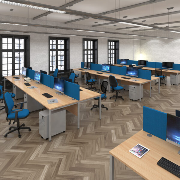 The fully welded H-Frame legs, available in black, silver, or white, provide exceptional stability and allow for shared support between desks, enhancing both efficiency and flexibility. A modesty panel adds privacy, while the durable 25mm melamine desktop ensures a sturdy, long-lasting work surface in a choice of contemporary finishes.