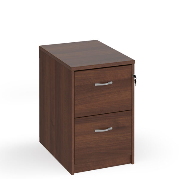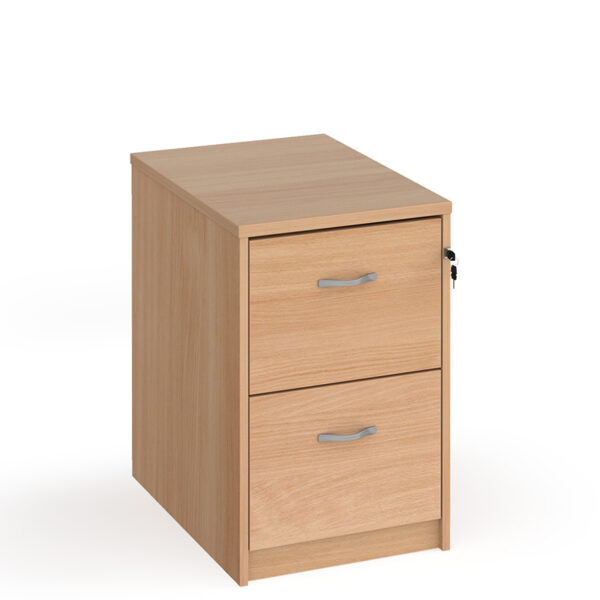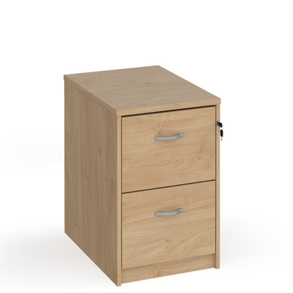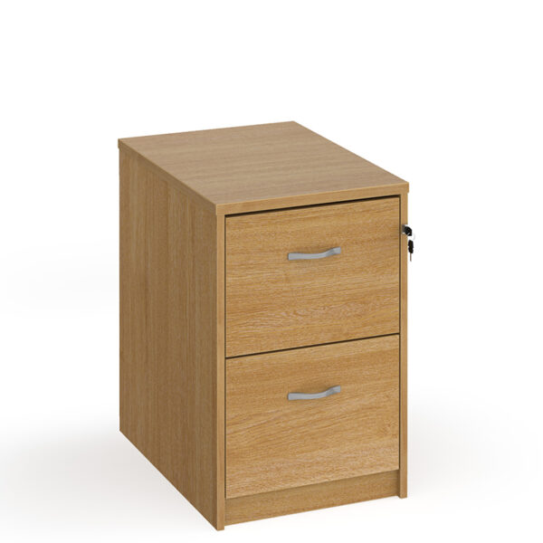 The Wooden 2 Drawer Filing Cabinet offers a sleek, practical storage solution designed to keep offices organised and professional. Ideal for foolscap files, it combines functionality with modern style, featuring silver curved handles and a durable build for everyday use. Each drawer is fully lockable for secure storage and fitted with ball‑bearing runners for smooth operation. With a 45kg weight capacity per drawer and 100% extension, it’s built for reliability. Available in multiple wood finishes, this cabinet complements any workspace and blends seamlessly with matching desks.