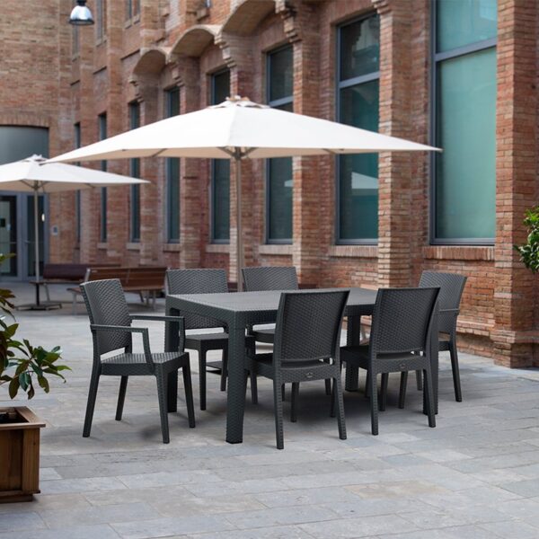 The stylish six-seater Rectangular table includes an impressive 40mm parasol hole, adjustable feet, and a 5-year warranty.