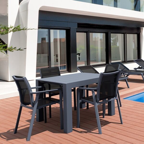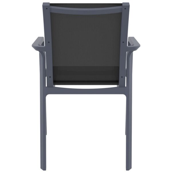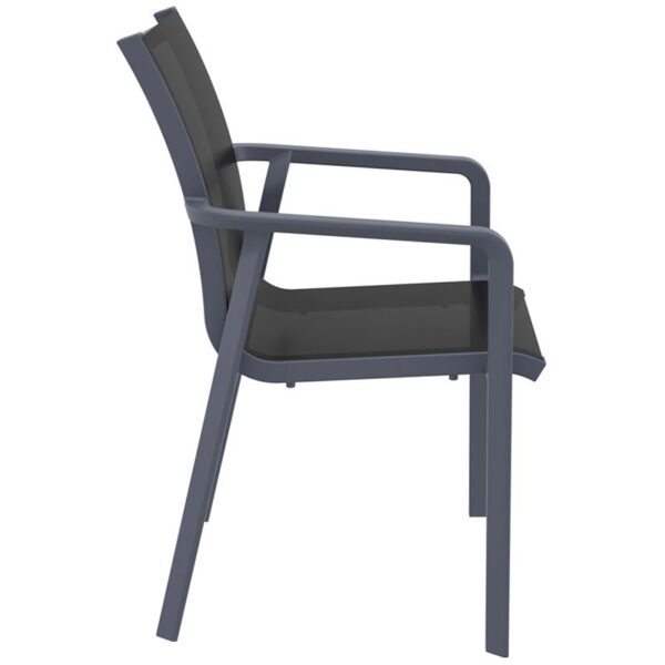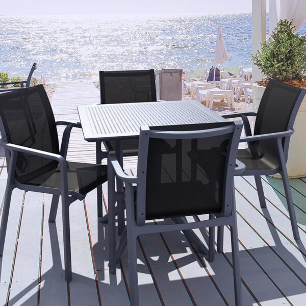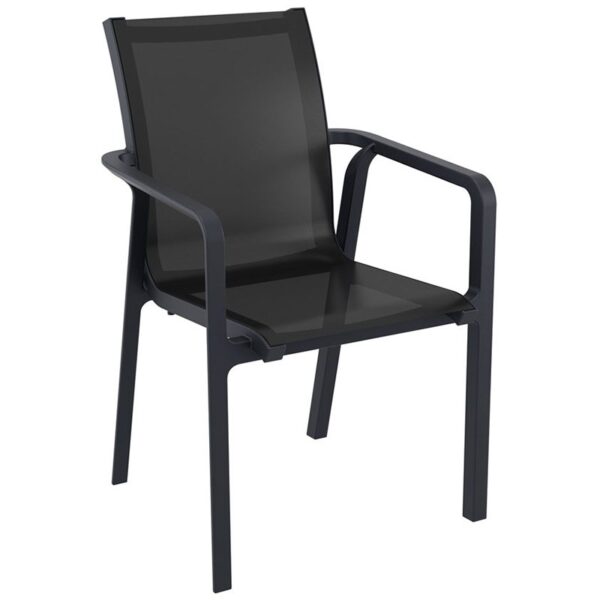 The Cortez Arm Chair is a stylish and dependable choice for any outdoor setting, combining contemporary design with contract-grade durability. Built with a strong grey frame, it features a seat and backrest made from premium black Batyline fabric that is weatherproof, UV-protected, and reinforced with glass fibre for added strength. This makes it highly resistant to sun exposure and sudden showers, ensuring reliable performance throughout the seasons.