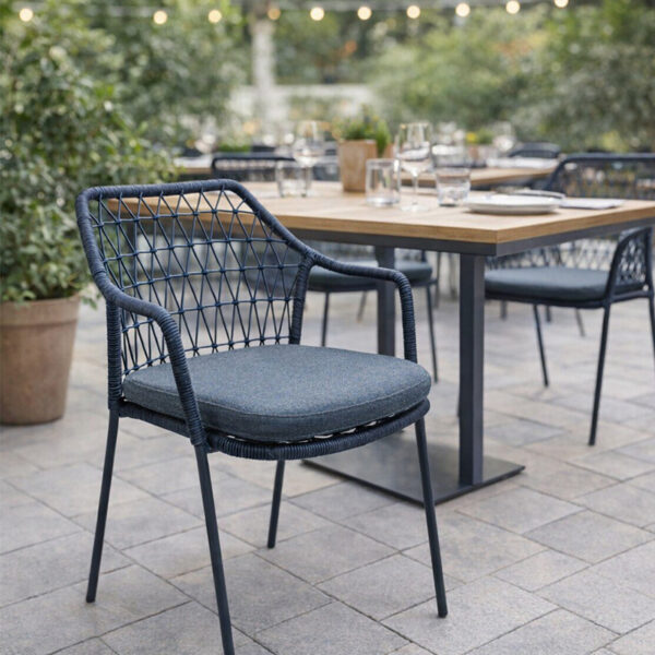 The Hunter Arm Chair brings contemporary style and dependable outdoor performance to gardens, terraces, and commercial spaces. Its hand‑woven synthetic rope backrest adds texture and visual appeal, while the galvanised steel frame and powder‑coated legs ensure strength and weather resistance. Finished with a water‑repellent tie‑on cushion, it delivers comfort and durability in equal measure.