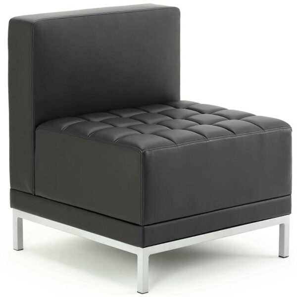 The Infinity Modular Straight Back Sofa Chair in Black Soft Bonded Leather features timeless Bauhaus-inspired styling, soft-touch bonded leather upholstery, and deeply padded panels for exceptional comfort. Finished with sleek silver box-profile legs, it’s an ideal choice for reception areas and modular seating arrangements.