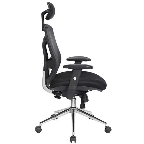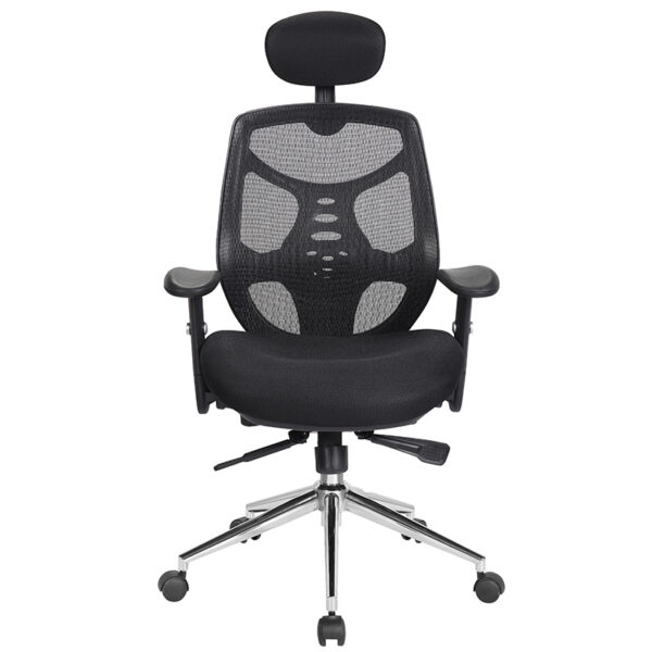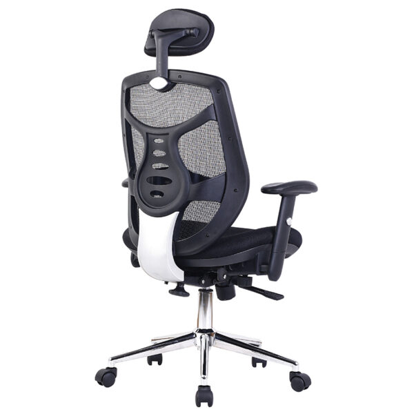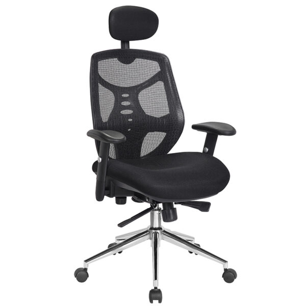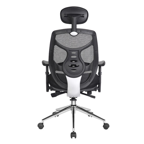 The Polaris High Back Mesh Executive Armchair delivers a refined blend of ergonomic support and contemporary style. Designed with a generously proportioned posture-curved upholstered seat and a moderate waterfall front, it promotes comfort during extended use. The contoured mesh backrest features integrated lumbar support, framed by a black nylon shell with chrome effect detailing for a sleek, professional finish. Its synchronous mechanism allows simultaneous adjustment of the seat and backrest, complemented by a fully reclining knee tilt function with tension control tailored to individual bodyweight. Height adjustment is effortless with the gas lift system, while the stylish T-shaped padded arms and large chrome spider base with twin-wheel hooded castors complete the chair’s executive appeal. Available in blue, red, or black mesh upholstery, Polaris is a standout choice for modern office environments