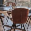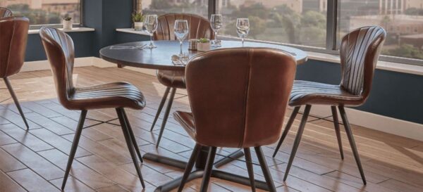 Upholstered in top-quality genuine leather, it offers a luxurious look and feel that enhances any space, from home lounges to hospitality venues. The sculpted seat and tapered back are designed for ergonomic comfort, ideal for long dinners, work sessions, or relaxed lounging.