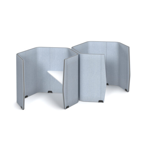 Designed for adaptable layouts, the system can be extended or reconfigured to fit your office requirements. Each unit provides visual and acoustic privacy, making it ideal for quiet work or private phone calls. Available in square, hub, triangle, and hexagonal shapes, the workstations suit a wide range of styles. Two-tone acoustic fabric options and white worktops with scalloped cable cut-outs add both practicality and a refined aesthetic.