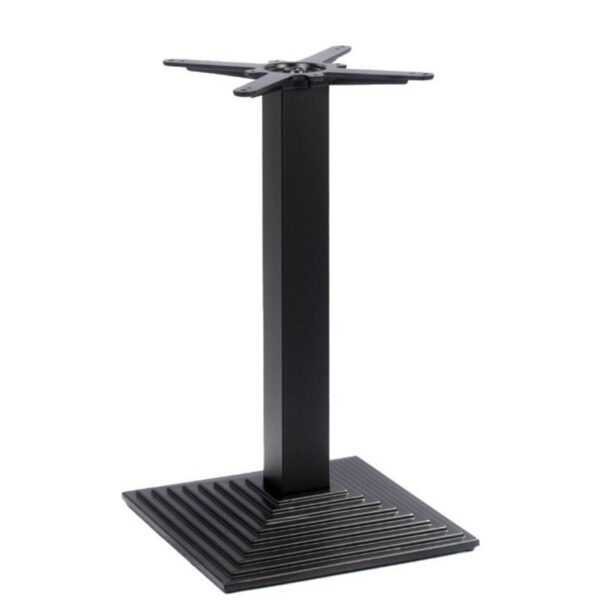 The Black Step Table Base features a durable black powder-coated cast iron construction with a square column and square pyramid base, making it ideal for high-traffic indoor dining areas. Designed for indoor use only, it is available in dining and poseur heights and is also offered with a round base option, providing flexibility to suit different table styles and layouts.