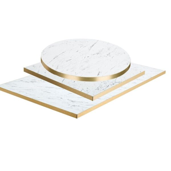 Acquaint yourself with our range of luxurious White Carrara Marble laminate tops with striking gold edge. This luxurious table top is perfect for those who want to add a touch of elegance to their dining experience. The sleek White Carrara marble laminate top is both scratch and heat resistant, making it ideal for busy Restaurants, Cafes or Bistros. The striking gold edging adds a touch of glamour and makes these tables really stand out from the crowd, whilst being impact resistant.