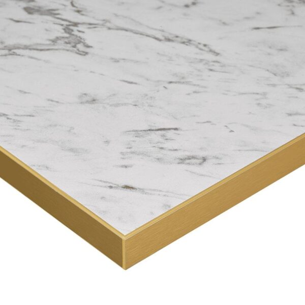 Stylish and durable, these 25mm Premium White Marble Laminate table tops are ideal for high-use contract environments. Featuring a striking white marble-effect finish with a contrasting 2mm gold ABS edge, they deliver a luxurious look with excellent durability. Scratch resistant, antimicrobial, easy clean, wipeable surface and low maintenance, they’re available in a range of shapes and sizes. Hand samples available, please get in touch.