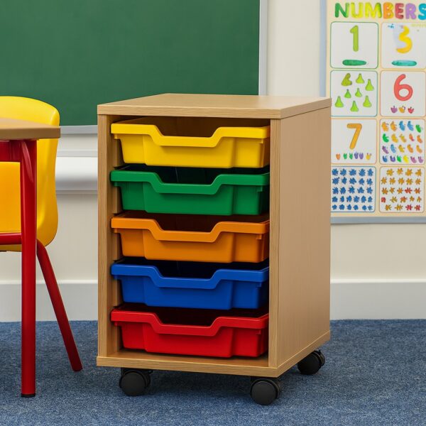 This 5 Tray single mobile unit is a premium, UK-manufactured storage solution designed for durability and versatility. It includes five Gratnells trays, available in a wide selection of 16 colours, allowing for customisation to suit any environment. The unit is offered in Beech, Maple, Oak, Grey, or White finishes, with optional doors and locks featuring safety hinges to prevent finger traps. Built from robust 18mm MDF with solid 8mm MDF backs, it can be configured as either static or mobile to meet your specific needs